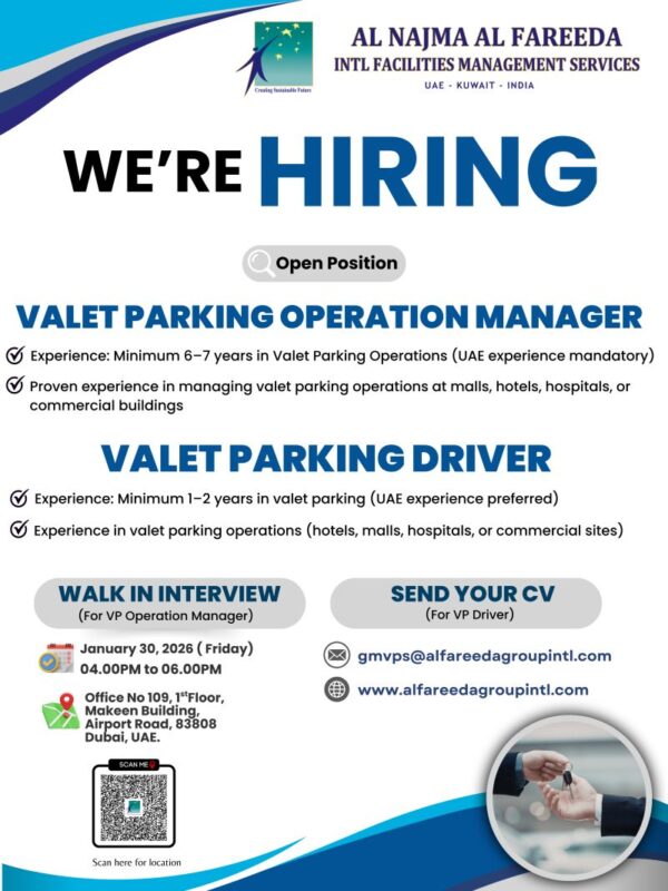 For Valet Parking Driver (Email CV): gmvps@alfareedagroupintl.com