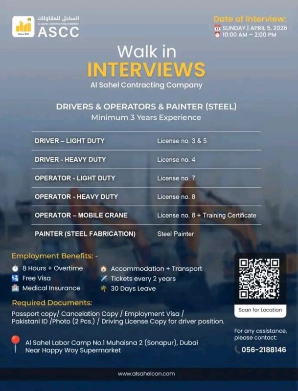 The Al Sahel Contracting Walk in Interview in Dubai is scheduled for 5 April 2026, which will enable candidates to meet the hiring team for direct recruitment without any waiting time. This opportunity provides both experienced workers and new graduates with an excellent chance to establish their professions in the construction and transportation industries of the United Arab Emirates.
