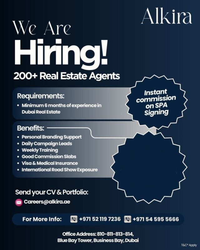 The announcement of Alkira Real Estate Walk in Interview in Dubai. The hiring campaign demonstrates the company’s rapid growth which needs more real estate consultants to work in Dubai’s competitive property industry. Alkira Real Estate is actively seeking ambitious and motivated individuals who wish to achieve professional growth through commission-based and incentive-based earning opportunities.