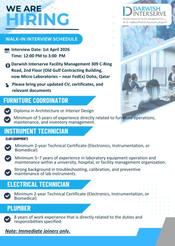 A promising career opportunity is now open for skilled professionals in Qatar as Darwish Interserve Facility Management announces its Walk-in Interview in Doha. This recruitment drive is aimed at hiring talented individuals for technical and maintenance roles across the company’s facility management projects. Professionals from Doha and nearby areas are encouraged to attend this walk-in interview to explore a rewarding career with a leading facility management company in Qatar.