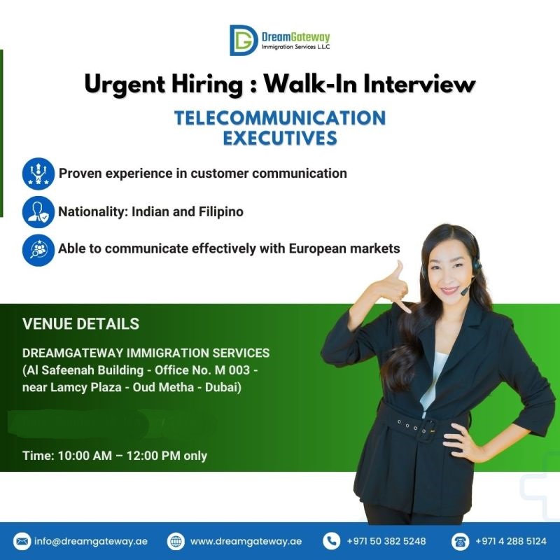 Job seekers who wish to establish their careers in Dubai’s expanding customer service and communication industry now find an excellent opportunity. The DreamGateway Walk in Interview will take place in Dubai to conduct immediate hiring for a position that requires candidates to possess excellent communication abilities. The recruitment drive aims to hire Telecommunication Executives who possess customer interaction skills for the Dubai market, making it suitable for professionals who have experience in international customer service.