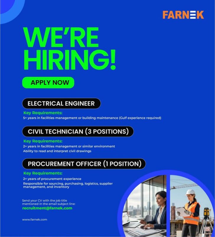 The latest Farnek Services Recruitment Job Announcements for April 10, 2026 are now available to job seekers wanting to find career opportunities with Farnek, one of the leading facility management companies in the United Arab Emirates. Candidates with technical qualifications will be able apply for a number of vacancies that Farnek has available for immediate hiring. The Farnek Services Recruitment Hiring Initiative is also a terrific opportunity for individuals who possess technical qualifications and who have experience in the field of maintenance, engineering or procurement to find stable and long-term employment with Farnek.