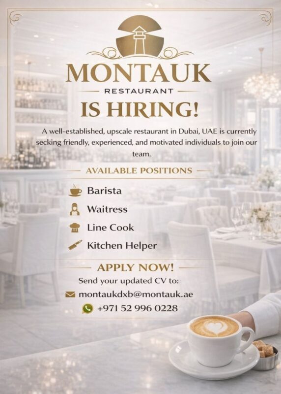 Montauk Restaurant is currently hiring for the following positions, all based in Dubai: