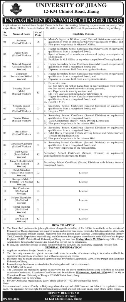 University Of Jhang Jobs 2026 For Pakistani Male and Female Apply Online. Are you seeking an excellent career opportunity in the government sector in 2026? University Of Jhang has announced the latest job openings for the year 2026, providing exciting roles for job seekers across Pakistan. Whether you’re male or female and meet the eligibility criteria, University Of Jhang offers you the chance to secure a stable and rewarding jobs.