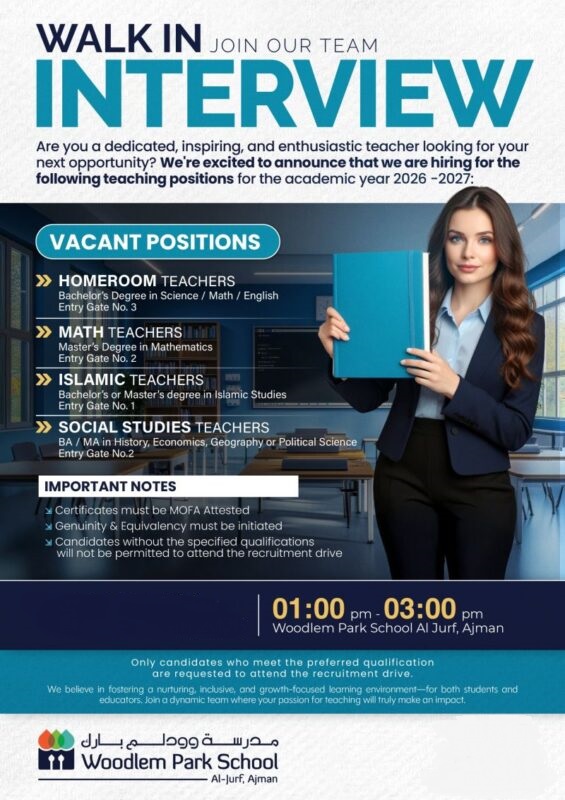For the upcoming academic year (2026/2027), Woodlem Park School located in Ajman is holding interviews for teaching roles, giving aspiring teachers throughout the UAE a chance to further their careers. The goal of the recruitment effort is to attract passionate, qualified, and dedicated educators to provide a strong foundational education in a way that promotes success and development of the students’ learning experience. The Woodlem Park School provides an ideal environment to work in an educational institution that meets a “best practice” standard of academic excellence, incorporates innovative strategies of instruction, and focuses on developing their students through an all-inclusive education.